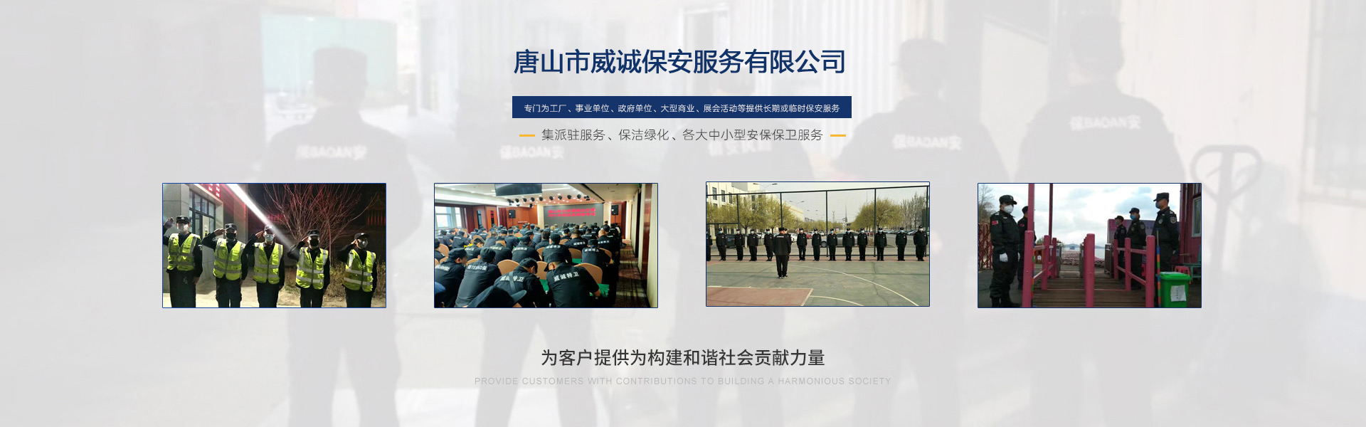 唐山市威誠(chéng)保安服務(wù)有限公司自成立以來以“嚴(yán)防死守、忠于業(yè)主”為服務(wù)原則,以“客戶滿意、 合作共贏”為根本目標(biāo)。以科學(xué)的管理、多方位多層次的服務(wù),建立了首問責(zé)任制,完善了走訪、回訪 、滿意度調(diào)查、末位淘汰的預(yù)警管理,不斷提高服務(wù)質(zhì)量,提高業(yè)主滿意度,提高企業(yè)形象。秉承“誠(chéng) 實(shí)守信,紀(jì)律嚴(yán)明,團(tuán)結(jié)協(xié)作,致精致誠(chéng)”的服務(wù)理念,為客戶提供高品質(zhì)、多方位、專業(yè)化的保安服務(wù)。 本公司制定了嚴(yán)謹(jǐn)?shù)亩ㄏ蛘猩徢芭嘤?xùn)、考核錄用、崗中培訓(xùn)、持續(xù)培訓(xùn)、末位淘汰制等一整套完善的管理體系。可以根據(jù)客戶的要求實(shí)地勘察評(píng)估,以量身定做的方式提供安保防范服務(wù)。